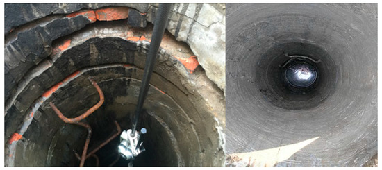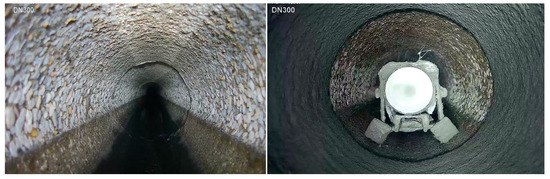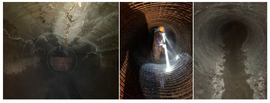 The types of defects and causes of damage of drainage pipes have been summarized in some detail in several works; corrosion and rupture are the most common in drainage pipes in China [6,31]. Young et al. summarized the damage types of concrete pipes, mainly longitudinal cracks, circumferential cracks, and joint damage [32]. For the typical damage type of concrete pipes with longitudinal cracks, Ballinger studied the whole process of concrete pipes, from the initial laying to the final damage, through experiments [33]. The corrosion damage inside the concrete pipe is mainly due to the gradual formation of H2SO4 when the H2S gas in the pipe encounters condensed moisture, which rapidly corrodes the inner wall of the concrete pipe, leading to gradual thinning and exposure of the concrete pipe inner wall, reducing the service life of the drainage pipe [34,35,36].