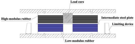 In this paper, an improved lead-core rubber isolation bearing is proposed, as shown in Figure 1. The horizontal stiffness of the isolation bearing is changed by using rubber with different shear modulus. The upper rubber layer of the isolation bearing is made of high-modulus rubber, and a lead core is added to the middle hole. The steel baffle is arranged on the lower connecting plate of the isolation bearing. The design specification and structure of the improved isolation bearing comply with the relevant provisions of the current codes in China [28,29,30,31]. There are two working conditions for the isolation bearing. The condition that the horizontal displacement δ of the middle steel plate of the isolation bearing is less than the reserved distance d of the limiting device is taken as the first working condition. Further, the condition that δ is greater than d is taken as the second working condition. The isolated bearing provides smaller horizontal stiffness in the first working condition, which improves the seismic isolation effect. In the second working condition, only the upper rubber layer and the lead core undergo shear deformation, which provides larger horizontal stiffness and damping to prevent excessive displacement of the isolation bearing and thus meets the deformation requirement.