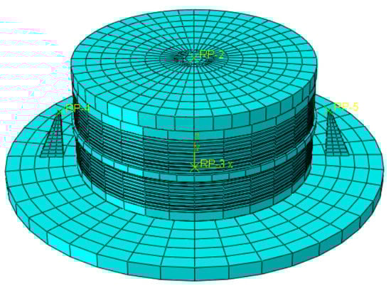 Rubber can be regarded as an incompressible material, so the 8-node reduced integral solid hybrid element (C3D8RH) was adopted for the rubber. In order to accurately simulate the mechanical properties of isolation bearings and improve the computational efficiency of the finite element method, the sandwich steel plate and the sealing plate were simulated by the C3D8R solid element. The meshing of the model is shown in Figure 3.