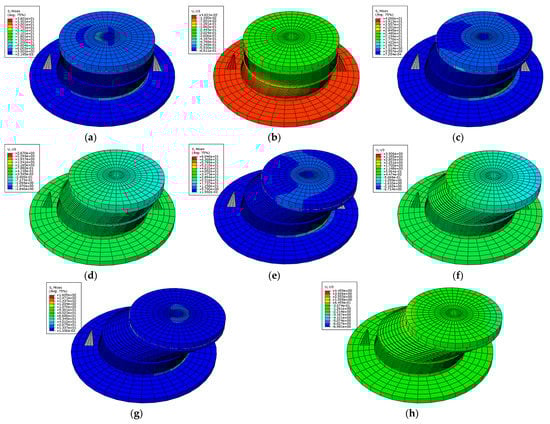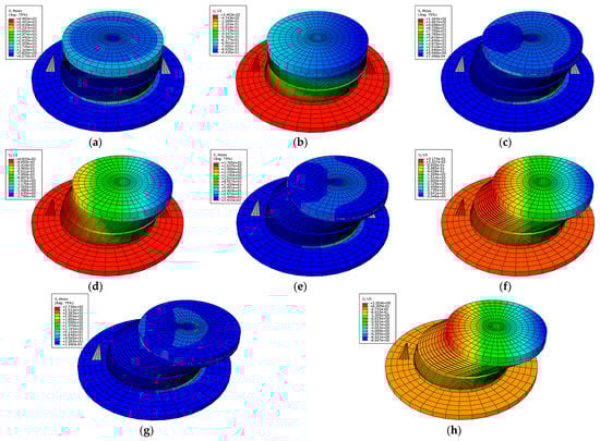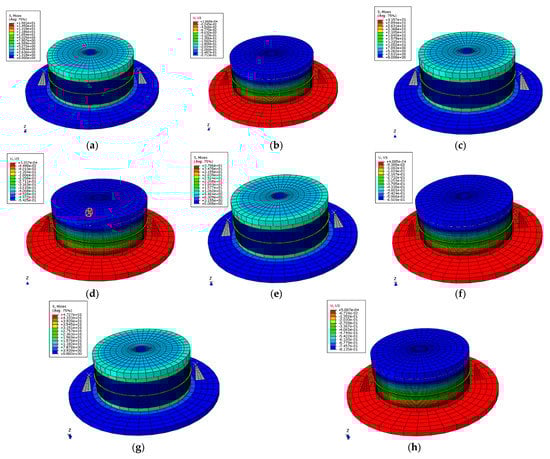 Stress cloud diagram and Z-direction deformation cloud diagram (15 MPa). (a) Stress distribution (γ = 50%); (b) Z-direction deformation (γ = 50%); (c) Stress distribution (γ = 75%); (d) Z-direction deformation (γ = 75%); (e) Stress distribution (γ = 125%); (f) Z-direction deformation (γ = 125%); (g) Stress distribution (γ = 175%); (h) Z-direction deformation (γ = 175%).