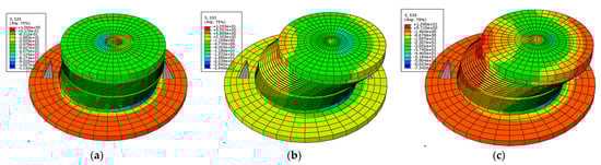 Z-direction stress cloud diagram. (a) Z-direction stress (γ = 50%, 5 MPa); (b) Z-direction stress (γ = 125%, 5 MPa); (c) Z-direction stress (γ = 125%, 15 MPa).