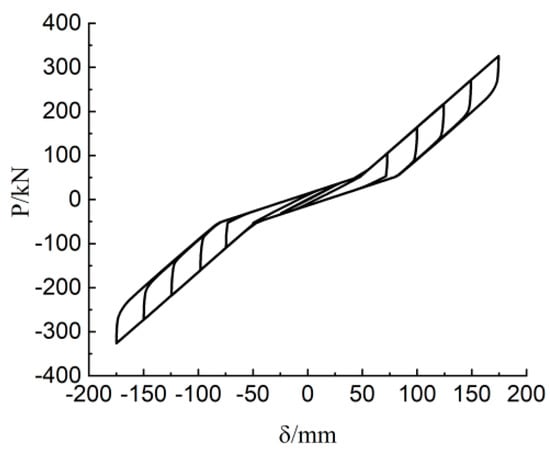In order to study the vertical compressive mechanical properties and horizontal compression-shear mechanical properties of the improved isolation bearing, vertical compressive stresses of 5 MPa, 10 MPa, 12 MPa, and 15 MPa were applied to the isolation bearing, respectively, according to the relevant regulations in the “Code for Seismic Design of Buildings” [40]. Through displacement control, the isolation bearing is subjected to cyclic loading with horizontal shear deformation of 50%, 75%, 100%, 125%, 150%, 175%, and 200%.