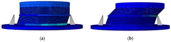As shown in Figure 8 and Figure 9, when γ is less than 25%, the slope of the hysteresis curve is almost unchanged. At this time, the lead core in the isolation bearing is not yielded and the isolation bearing has almost no energy dissipation capacity. When γ is greater than 25% and less than 50%, the slope of the hysteresis curve decreases. The rubber layers of the upper and lower parts of the isolation bearing work synergistically, and the stiffness decreases. When γ is greater than 50%, only the upper rubber layer and lead core undergo shear deformation. The slope of the hysteresis curve increases and the energy dissipation capacity is continuously increasing. This shows that the limiting device divides the working conditions of the improved isolation bearing into two types: (1) The first working condition is when the horizontal shear strain γ of the isolation bearing is less than 50%, as shown in Figure 10a. At this time, the rubber with low shear modulus at the lower part of the isolation bearing first undergoes shear deformation, which provides less horizontal stiffness and better seismic isolation effect. (2) The second working condition is when the horizontal shear strain γ of the isolation bearing is greater than 50%, as shown in Figure 10b. The limiting device limits the deformation of the rubber with the low shear model at the lower part of the isolation bearing, while the rubber with the high shear modulus at the upper part of the isolation bearing undergoes shear deformation to provide greater horizontal stiffness. At this time, the lead core starts to give full play to the function of energy dissipation.