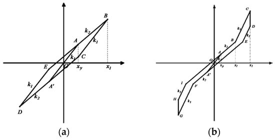 According to the results of finite element analysis, a simplified restoring force model of the improved isolation bearing is obtained, as shown in Figure 11. When the isolation bearing is in the first working condition (δ is less than d), the restoring force model is simplified to a two-fold line model. Δ is the horizontal displacement of the bearing. D is the horizontal critical displacement of the bearing when the limiting device starts to work. In the figure, k1 is the stiffness of the isolation bearing before yielding, k2 is the stiffness of the isolation bearing after yielding, xy is the yield displacement, and x1 is the ultimate displacement.