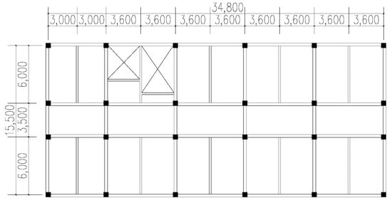 Based on the site conditions in Xi’an, China, a reinforced concrete frame structure was designed according to the relevant codes for architectural and structural design [40,41,42,43]. There are six floors above ground. The height of the ground floor is 3.9 m, and the other layers are 3.3 m. The height of the structure is 20.4 m. The arrangement of beams and columns on the standard floor of the frame is shown in Figure 12. The fundamental period of the first vibration mode of the structure is 0.635 s. The elastic story drift angle is 1/583. The superstructure of the other two isolation structures is the same, and the layout of the bearings of the isolation layer is shown in Figure 13. The site category is the Class II area. The constant load of floor and roof is taken as 4.0. The standard value of live load is 2.0. The standard value of load for infill walls and partition walls is 8.0. The concrete strength grade is C30. The thickness of the plate is 120 mm. Longitudinal steel bars and stirrups are uniformly adopted HRB400.