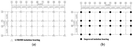 Layout of the bearings of the seismic isolation layer. (a) Normal isolation bearing; (b) Normal isolation bearing.
