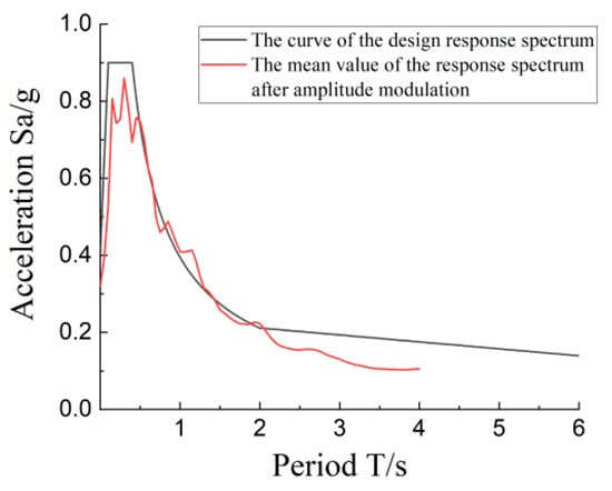 Using the single-point amplitude modulation method, as shown in Equation (3), the matched 120 ground motion records were amplitude-modulated to three intensity levels. Finally, five natural ground motion records and two artificial waves were selected for subsequent analysis. The amplitude modulation coefficients of ground motions are shown in Table 6. The mean value of the acceleration response spectrum of the seven selected waves that are amplitude modulated to the intensity of the rare earthquake is shown in Figure 14. The mean value curve of the response spectrum after amplitude modulation is similar to the curve of the design response spectrum. The error of spectral acceleration near the fundamental period of the structure (0.635 s) is small. This indicates that the selected ground motion records are reasonable.