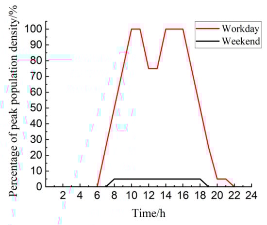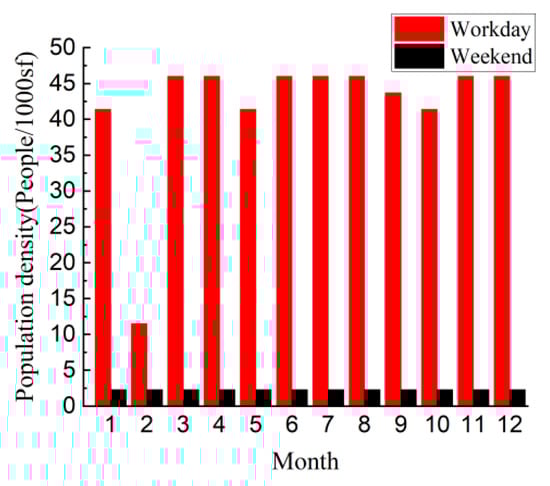 The human mobility model in PACT defines the peak of personnel density and the flow of personnel with time, week, and month in the building. According to the recommended values for the indoor personnel density of various building rooms in the “Standard for seismic resilience assessment of buildings” [45], the indoor personnel density ζk of the k-th floor can be calculated according to the actual personnel density of the evaluated building or the function of the house on the floor. The indoor personnel density can be determined according to Equation (14). According to the actual functional layout of the building, the indoor personnel density is calculated as 0.5 persons/m2, which is converted into imperial units as 46 persons/1000 sf. The change of personnel density at different times of the day is shown in Figure 17. The change of personnel flow in different months of the year is shown in Figure 18.