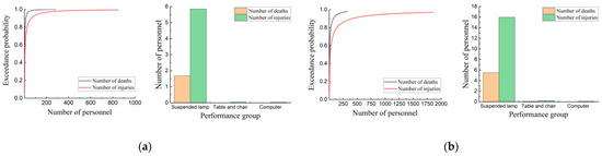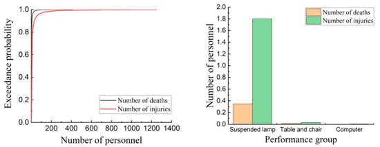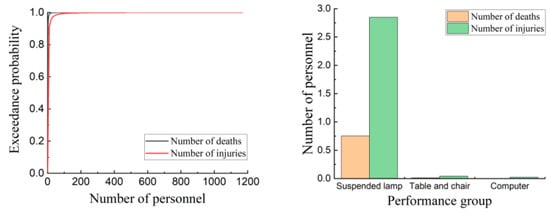 The results of casualties of the normal frame structure under fortification earthquakes and rare earthquakes are shown in Figure 22. The results of casualties of the normal isolation structure and the improved isolation structure under equal to 1.2 g are shown in Figure 23 and Figure 24. According to Table 12, the number of casualties of the normal frame structure is the largest, followed by the normal isolation structure, and the number of casualties of the improved isolation structure is the least. The normal isolation structure and the improved isolation structure exhibit better seismic isolation effects under fortification earthquakes and rare earthquakes, which significantly reduce the casualties. When is equal to 1.2 g, the seismic isolation layer of the normal isolation structure has already occurred over-limit failure under some seismic waves, and the seismic isolation layer of the improved isolation structure suppresses the over-limit failure. Namely, the performance of the improved isolation structure is much better than that of the normal isolation structure at the median value (P = 50%) of the performance index of casualties. The number of deaths and injuries in the improved isolation structure decreased by 52.6% and 36.8%, respectively, compared with the normal isolation structure. The reduction ratio of the number of deaths is higher than that of the number of injuries. This is also the evidence that the improved isolation bearing can effectively prevent the seismic isolation layer from over-limit failure. According to the distribution of performance groups, casualties are caused by the damaged suspended lamps, tables and chairs, and computers, which are acceleration-sensitive members. The damaged suspended lamps are the leading cause of casualties.