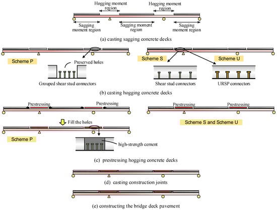 - Compared to the traditional scheme, the applications of the post-connected construction method and URSP connectors in the hogging moment regions may lead to approximately 12% and 18% increases in deflection, respectively. Therefore, attention should be paid to this when the design is controlled by girder stiffness. The steel girder stress was also increased in these two innovative schemes, but a significant increase only occurred in the top flange near the middle supports, which may be eliminated by local strengthening measures.