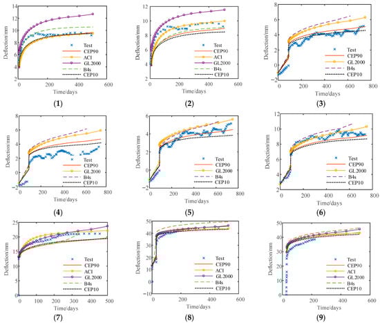 - The commonly used shrinkage and creep prediction models are in different agreements with the long-term performance tests of composite beams in the literature, and the CEP90 model was adopted in this study. In addition, the short-term behaviors of the specimens with URSP connecters predicted by the FE models were in good agreement with the test data, indicating that the modeling strategy was reliable.
