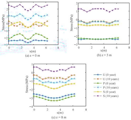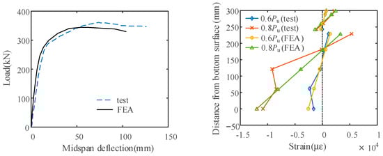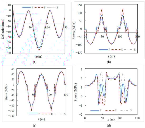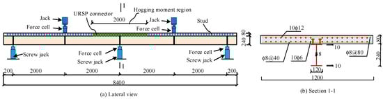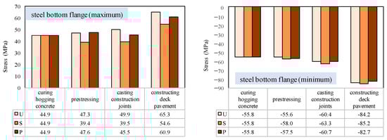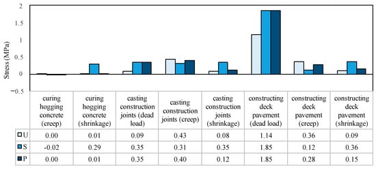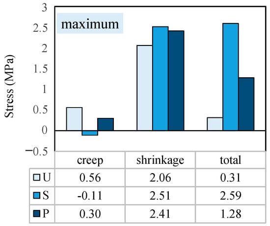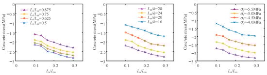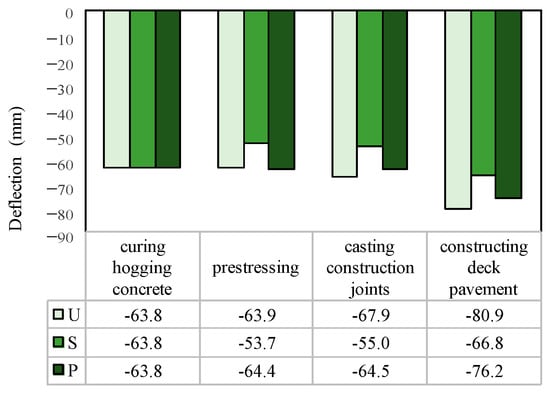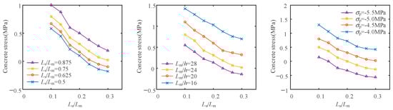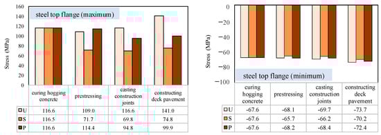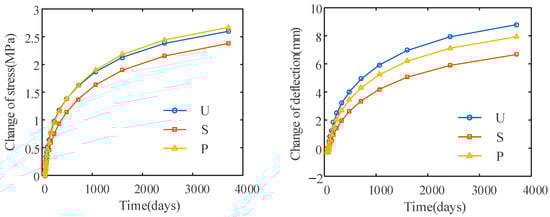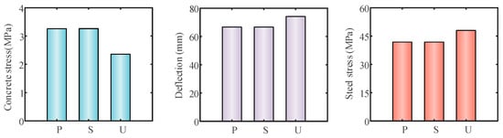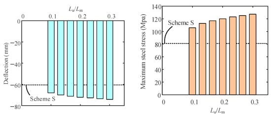 - The results of the parametric analyses indicate that with an increasing URSP length, the concrete stress decreased under various span length ratios, span–depth ratios, and prestress levels. The tensile stress induced by the concrete creep effect can reduce the influence of these factors. The increase in the URSP length ratio brought about increases in the deflection and steel stress, but the effect of the URSP length ratio on the concrete stress was more significant. Overall, a value of 0.2 is recommended as the URSP length ratio.