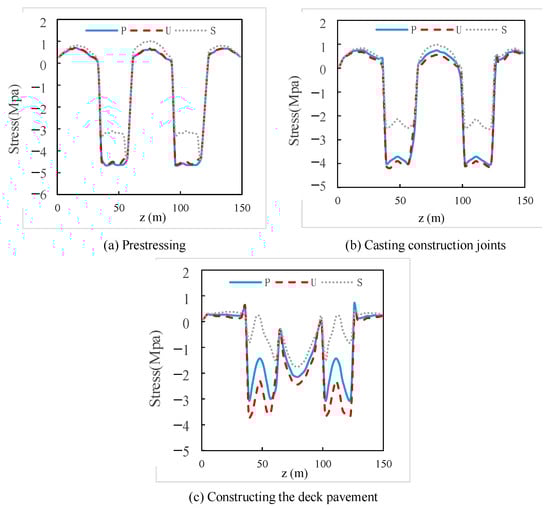 - Scheme U, where the URSP connection technique is applied in the hogging moment region can effectively increase the prestressing efficiency and decrease the tensile stress of the concrete induced by dead loads and vehicle loads. With an increasing service time, the concrete shrinkage effect will enhance the advantage of Scheme U, while the creep effect will reduce this advantage. In general, it was deduced that Scheme U was the most superior scheme from the perspective of concrete crack resistance in the hogging moment region, among the three schemes considered in this study.