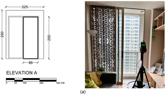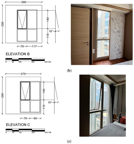 The selected case in this study is a high-rise residential building in West Jakarta named Taman Anggrek Residence. It is located among high-rise buildings and surrounded by lower-rise settlements (Figure 3a). The apartment unit of Taman Anggrek Residence was on the 38th floor at 120 m high with a typical floor plan in a double-loaded corridor configuration (Figure 3b). The selected apartment was a two-bedroom apartment in the corner with one living dining kitchen (LDK) area, two bedrooms, one bathroom and a balcony. The corner location allowed more facade exposure to the outdoors. Figure 3c illustrates the room simulated in this research: the living room and the master bedroom. A sliding door to the balcony configures Opening A (Figure 4a) in the living room, and the opening area corresponds to the 14.2% of the gross living floor and 32.9% of the window-to-wall ratio. The master bedroom has two window openings, Opening B (Figure 4b) and Opening C (Figure 4c); both have similar opening sizes, 140 cm high and 70 cm wide, and the total of both openings corresponds to 21.5% of the gross living floor and 12.2% of the window-to-wall ratio. Opening A and B are both facing south, and Opening C is perpendicular to the other openings, facing west.