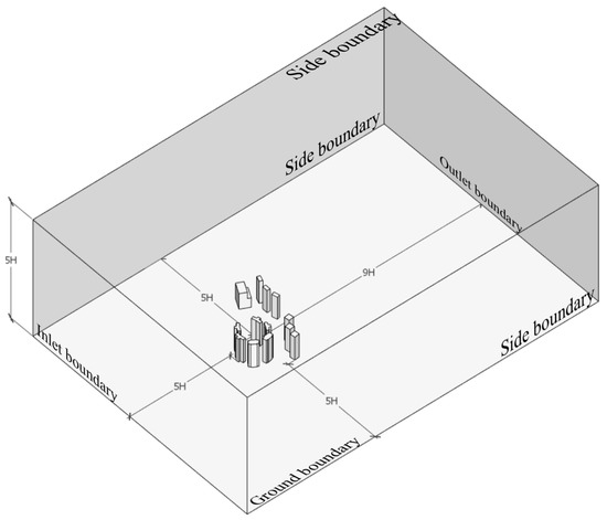 Furthermore, to reduce the computational time, we assigned a symmetry wall to the side boundary, and a no-slip wall function was assigned to the ground boundary. The boundary of the modelled building wall and surrounding buildings were assigned as an internal wall of the external computational domain. Table 1 summarizes the current simulation’s turbulence model, domain, boundary, and mesh settings.