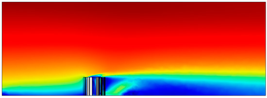 The results of ABL simulation are presented in Figure 6. The building cases were surrounded by similarly high buildings. Furthermore, the surroundings affect the wind contour and direction around the building case as shown in Figure 7.