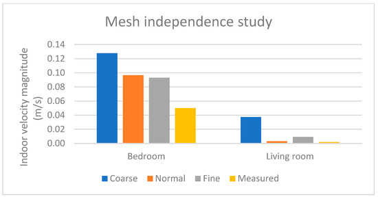 Furthermore, Figure 8 and Table 2 illustrate the results of the mesh sensitivity study. The results between coarse and normal mesh sizes have deviated after running three different simulations with three different mesh sizes. In the case of the bedroom, there was little difference in results between simulations with normal and fine mesh sizes. The simulation results deviated but not as much as when coarse mesh settings were applied. In the case of living room, normal mesh settings suggested closer results to the actual measurement results. Figure 9a showed that the airflow pattern was different with coarse mesh compared to the simulation results with normal (Figure 9b) and fine mesh settings (Figure 9c). Therefore, the results from the coarse mesh setting can be eliminated since it also overestimated the results compared to the measurement results. All mesh settings produced comparable patterns in terms of airflow. Therefore, this study employed a normal mesh setting with adjusted mesh size in the smaller domain region for the meshing options in the simulation because it required less computational cost than applying a finer mesh size. The mesh shape selected was tetrahedral, and the final mesh generated comprised a total of 2,226,920 cells. The average mesh quality in skewness was 0.6623, with the minimum mesh quality being 0.1083. The mesh quality was still acceptable within the good quality mesh to reduce errors and uncertainties. The general mesh sequence followed Table A1, Figure A1, Figure A2 and Figure A3 illustrate the meshing of the domains (please refer to Appendix A).