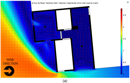Table 2 compares the CFD simulation results of the various scenarios applied to the building and the average of the measured velocity magnitude. The accuracy of the instruments limited this study because the instrument recorded the indoor wind speed in rounded numbers. However, the simulation results were nearly identical to the instruments’ readings. Therefore, we can validate the simulation results of the building’s current CFD setup because the results closely confirmed the measurement results. When the outdoor wind was lower at 1–2 m/s, the simulation yielded similar results to the indoor air velocity. In the case of the bedroom with an outdoor wind speed of 2 m/s, the simulation predicted a slightly lower speed than the measured one. However, this could be due to the rounded number of the instrument readings.