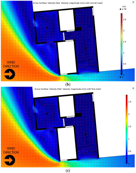 The airflow pattern in the building with different mesh sizes: (a) coarse mesh; (b) normal mesh; and (c) fine mesh. The mesh setting is presented in Appendix A.