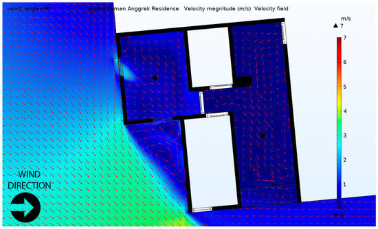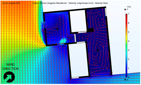 We tested with the two most prevalent wind directions that occurred during the measurement period, from west and southwest. There was one opening in the living room (Opening A) and two in the bedroom: Opening B on the south side and Opening C on the west side. When the wind came from the southwest, it occurred at 45° incident to the openings. The modelling result as shown in Figure 10 revealed a very low velocity magnitude, and the airflow within the living room was quite modest. The arrow represents the velocity field, and the size suggested the magnitude of the indoor air velocity. Cross ventilation occurred in the bedroom where the outdoor wind entered from Opening B and exited from Opening C. Single-sided ventilation occurred in the living room where air entered and exited from the same Opening A. The air movement occurrence was more apparent in Figure 11 due to the higher velocity magnitude occurring when the outside wind speed was higher, which rarely occurred. Nevertheless, the facade openings still provided airflow circulation inside the rooms.