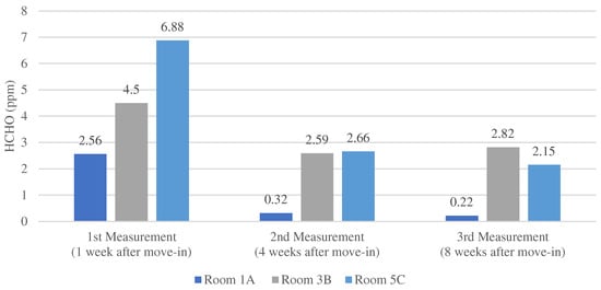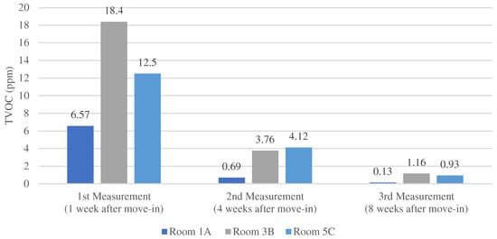 Similarly, in room 3B, the TVOC concentration decreased from 18.4 ppm to 1.16 ppm, and the HCHO concentration decreased from 4.50 ppm to 2.82 ppm over 8 weeks. In addition, the degree of ventilation increased in this room, and the number of occupants decreased from 1 to 0 during the second measurement.