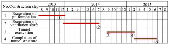Chart 1. We also labeled five time nodes on the flowchart, including ① the end of the pit excavation of Gulou Station; ② the end of the excavation of the ventilator shaft; ③ the start of the excavation of the triple-arch tunnel; ④ the end of the triple-arch tunnel excavation; and ⑤ the end of the whole project.