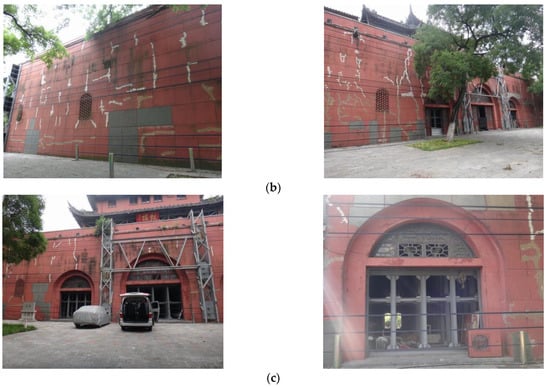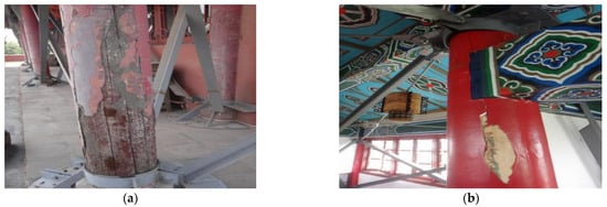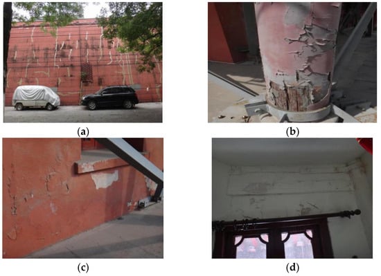 The timber-framed structure. There existed a maximum inclination rate of 13.48‰ for the eave columns and a deflection of 7.5~40.0 mm for the eave beams. The inclination of the walls of the timber-framed structure was 28~160 mm, with a maximum inclination rate of 22.9‰. Due to the aging of the timber-framed structure, cracks could be found on the exterior walls and wooden frames, including pillars and trusses and the roof, and the mortar cover on the walls and eave columns and beams had peeled off, as shown in