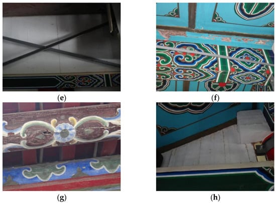 Deterioration of the timber structure, including pillars, walls, and joints. (a) Vertical cracks on the terrace. (b) Deterioration of the wooden colonnade. (c) Cracks on the masonry wall. (d) Leakage on the masonry beam. (e) Cracks on the timber structure. (f) Mortar cover peeling off the beam. (g) Cracks on the wooden beams. (h) Cracks on the wooden roof.