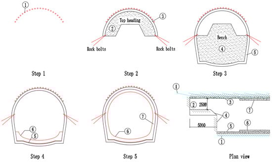 Step 1: To improve ground stability, cement grout was injected into the rock mass via the boreholes drilled in the tunnel face. Step 2: The crown (Section ②) was excavated by using the milling excavation method to reduce the effect of the soil disturbance on Gulou Tower, and a temporary support of shotcrete was installed. The central part was kept during Step 2, with rock bolts (diameter = 30 mm and length = 3 m) installed at the bottom of the shotcrete to reinforce the stability of the excavation face. Step 3: The bench part (Section ④) was excavated after the installation of steel mesh around the freshly excavated face and protected by early-strength shotcrete with a 28-day characteristic compressive strength of 25 MPa. Step 4: Shotcrete was applied to the bottom of the tunnel, and a concrete lining ⑥ was installed. Step 5: An upper concrete lining ⑦ was installed to support the cavity.