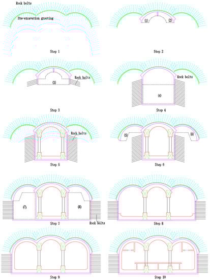 Figure 5. Pre-excavation grout was firstly injected into the rock mass, and rock bolts were installed to provide the initial support for the tunnel excavation. The top heading parts (1) and (2) of the middle tunnel were excavated in Step 2, and concrete lining was installed in the ceiling of the tunnel to support the excavated face. Then, bench parts (3) and (4) were excavated, and rock bolts and columns were installed to support the middle tunnel during Step 3, Step 4 and Step 5. After that, the top heading parts (5) and (6) of the side tunnels were excavated, and the corresponding top linings were installed in Step 6. Bench parts (7) and (8) were then excavated, and rock bolts were installed to support the sidewalls of the side tunnels in Step 7. After that, the inverts of the side tunnels were constructed in Step 8, and the final concrete linings were casted in place in Step 9 and Step 10.