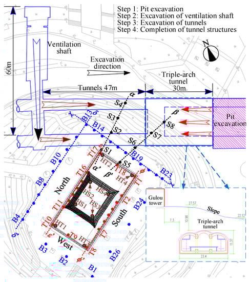Figure 6 illustrates the construction procedures of the whole project and the monitoring points of the ground surface and Gulou Tower. The arrows represent the excavation directions of the ventilation shaft, the two tunnels, and the triple-arch tunnel, and the four-phase construction procedures are summarized in