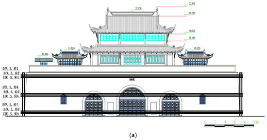 Sectional view of hybrid timber–masonry historical structures. (a) South elevation. (b) North elevation. (c) East elevation. (d) West elevation. (e) Perspective drawing of the masonry terrace.
