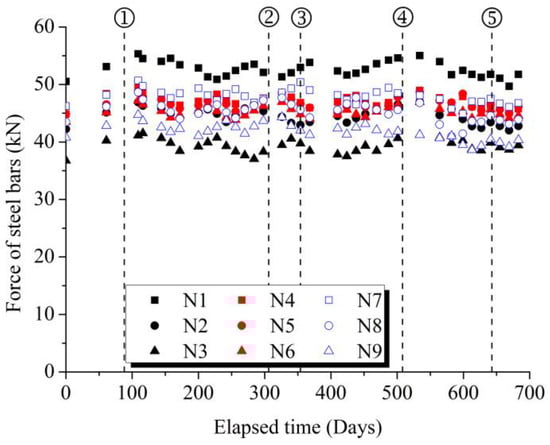 Figure 7. Each bundle of steel wires consisted of seven steel strands of American ASTMA416-92 standard with a diameter of Φ5 and a standard strength of 1860 MPa. Then, 6 cm thick rubber isolators were placed between the steel columns and the terrace to avoid direct contact, which could damage the bricks. With the initial pre-stress ranging from 45 kN to 50 kN, the stress variations of the steel wires during the tunnel excavation are presented in