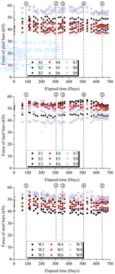Figure 8, with E, W, S, and N standing for the four elevations of the terrace. We could observe an increase in the tensile stress during the tunnel excavation between time nodes ③ and ④, especially for the steel bars at the north elevation and the east elevation, which are close to the tunnel excavation. After the tunnel excavation (from time node ④ to ⑤), the tensile stresses of the steel wires in the four elevations gradually reduced to the initial pre-stresses. Meanwhile, the passenger tunnel of the terrace was reinforced by a steel frame, as shown in
