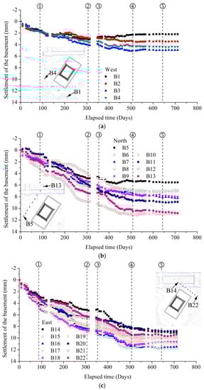 Figure 11, increased rapidly at time node ① since these points were closer to the pit excavation. The excavation of the ventilation shaft resulted in a greater settlement increase at the monitoring points from B5 to B13 in