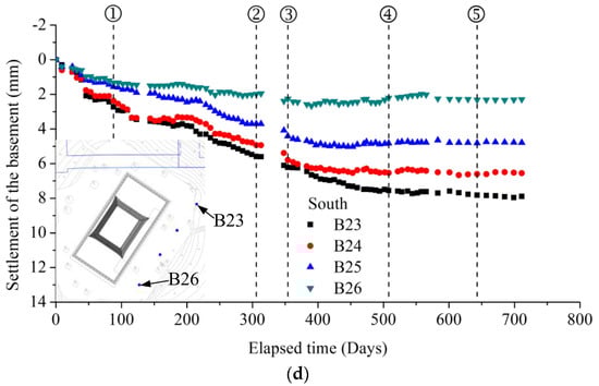 Recorded surface settlements around Gulou Tower from 22 September 2013 to 1 September 2015. (a) Measured surface settlements from B1 to B4. (b) Measured surface settlements from B5 to B13. (c) Surface settlements from B14 to B22. (d) Surface settlements from B23 to B26.