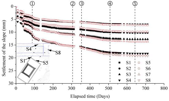 Figure 11, with the elapsed time from 22 September 2013 to 1 September 2015. Meanwhile, we further present the settlement curves along Line