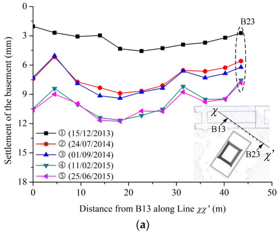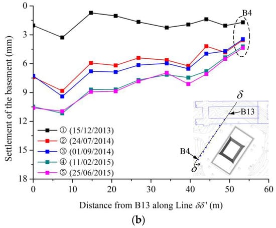 Settlement distribution along Line χχ′ (From B13 to B23) and Line δδ′ (From B4 to B13) at different time nodes. (a) Settlement along Line χχ′ at different time nodes. (b) Settlement along Line δδ′ at different time nodes.