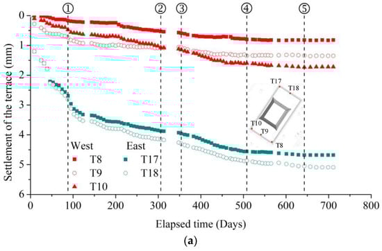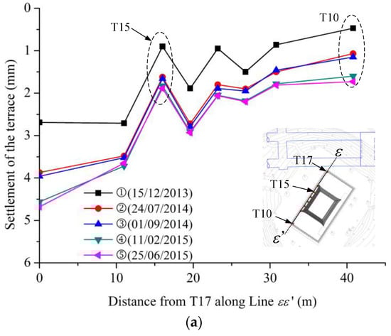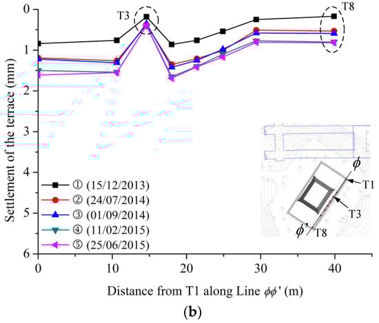 Settlement curves of the terrace along Line εε′ and Line ϕϕ′ at different time nodes. (a) Settlement curves along Line εε′. (b) Settlement curves along Line ϕϕ′.