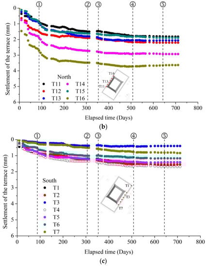 Settlements of monitoring points at the terrace during the tunnel excavation and the station construction. (a) Settlement at the west and east elevations. (b) Settlement at the north elevation. (c) Settlement at the south elevation.
