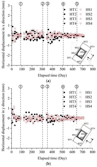 Horizontal displacements of the monitoring points at the terrace (HT1 to HT4) and the timber-framed structure (HS1 to HS4) during the tunnel excavation and the station construction. (a) Horizontal displacement in the x direction. (b) Horizontal displacement in the y direction.