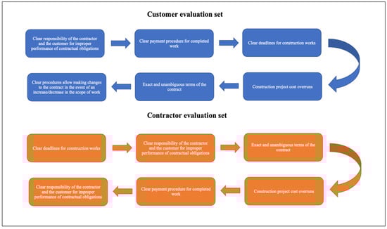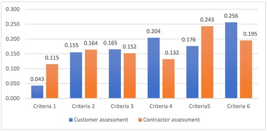 While the contractors identified criterion 5 (clear deadlines for construction works) as the most important and most significant, followed by criterion 6 in second place, criterion 2 in third place, criterion 3 in fourth place, criterion 4 in fifth place, and criterion 1 in sixth place; i.e., both groups consider clear procedures allow making changes to the contract in the event of an increase/decrease in the scope of work, as the less significant criterion among the analyzed criteria. The experts’ significance of the criteria is shown in Figure 2.