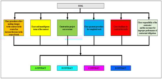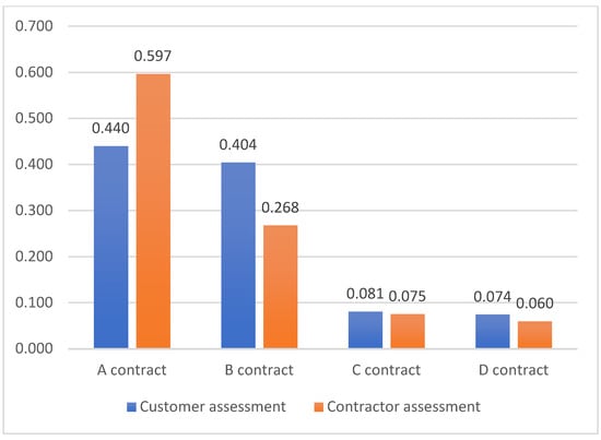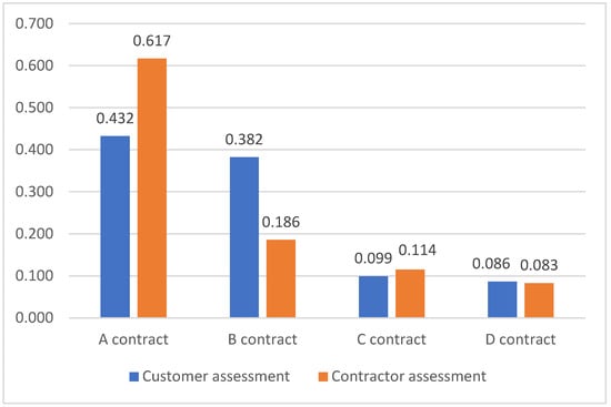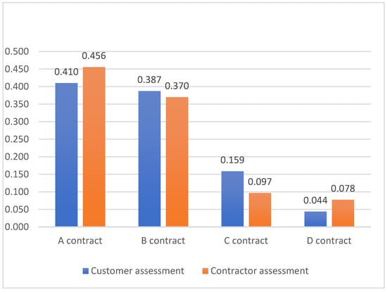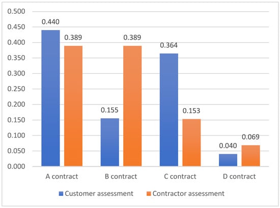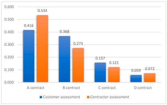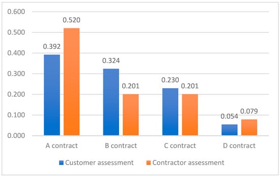 In the analysis of the contractors’ expert decision matrix, the first contract A is the clear leader, with a difference of 48.88% between the first and second ranked contracts, and 40.5% between the third and fourth ranked contracts. Analyzing the customers’ expert decision matrix, the difference between the first and second contract is not extremely significant (11.54%), while the difference between the third and fourth contracts is significantly higher and reaches 62.42%.