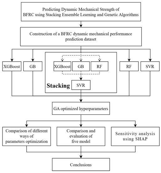 In light of the above observations, our study has the following aims: (1) using experimental data from the relevant literature, a comprehensive BFRC dynamic mechanical property prediction dataset will be constructed based on SHPB experiments; (2) an advanced stacking ensemble algorithm will be developed and validated to predict the BFRC dynamic increase factor (DIF) accurately; (3) the optimization problem of determining the key parameters of the model will be solved, and the actual performance of the optimization result verified experimentally; and (4) to elucidate the model and its sensitivity to input variables, as well as to identify the crucial factors influencing the dynamic mechanical performance of BFRC, we will conduct a characteristic importance analysis using SHAP on the input variables. The flow chart of the study is shown in Figure 1.