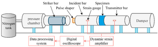 Currently, SHPB devices are widely used to solve various problems, such as dynamic compression problems, tension, torsion, and triaxial compression. The experimental data from SHPB devices are reliable, and they are easy to use. SHPB devices mainly consist of a firing system, a pressure bar system, a data acquisition system, and a data processing system, as shown in Figure 2. The SHPB test can obtain the dynamic mechanical response of the material under high-speed deformation. Data on the incident pulse (), the reflected pulse (), and the drive pulse () are collected during the test using strain gauges positioned on the incident bar and the drive bar, respectively. According to the one-dimensional stress wave theory, the plane section assumption and the stress uniformity assumption, the strain (), stress () and strain rate () values were calculated by Equation (1) as follows [27].