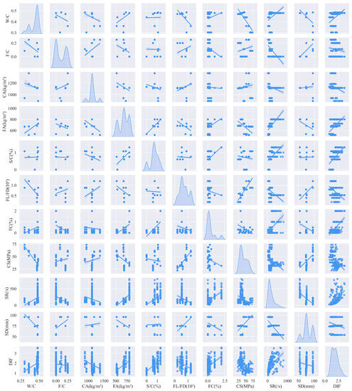 The coefficient matrix can also yield conclusions comparable to those presented here (Figure 4). CA, FL/FD, and CS all exhibited a negative correlation with CS, with corresponding correlation values of −0.3, −0.42, and −0.52. The degree of the positive correlation among W/C, FA, S/C, FC, SR, and DIF was comparable to 0.45, 0.59, 0.58, 0.55, and 0.54, respectively.