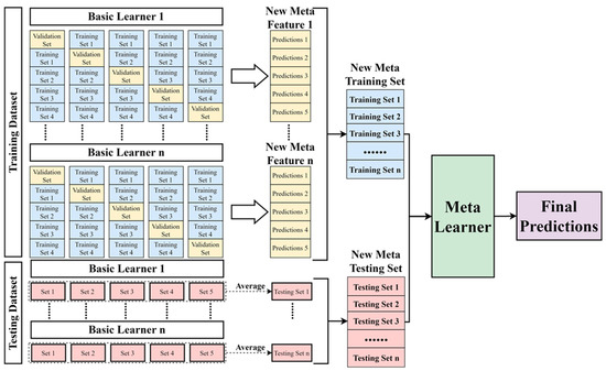 The stacking model is a hierarchical model ensemble framework where a new regressor combines several individual base learning predictions to predict the target variable [37]. The stacking model usually contains basic models and the meta-learner. The basic models rely on different kinds of algorithms to learn from the original dataset and produce the meta-feature dataset. The meta-learner applies the meta-feature dataset to learn each base model’s strengths and flaws and logically blends their predictions to generate the best performance. K-fold cross-validation is frequently used throughout the training phase of a single basic model to prevent overfitting and guarantee that all original data sets participate in the generation of a new meta-feature dataset. The training process of a single basic model and the structure of the entire stacking model are shown in Figure 5.