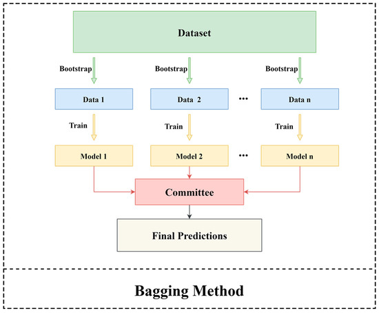 RF is an integrated learning algorithm that reduces the fluctuations of a single decision tree by constructing an ensemble of decision trees [39]. By using the concept of “bagging”, many similar data sets randomly selected from the training set are aggregated to create a forest [40]. The bagging algorithm is a parallel algorithm that uses randomly selected training data with put-backs and constructs a classifier; the results are then combined and output. So that nodes are randomly picked with enough features, the RF algorithm optimizes them based on bagging. A suitable feature is obtained from randomly picked sample features for the decision tree’s left and right subtree divisions. They lessen the decision tree’s instability and improve its generalization capabilities. Figure 6 shows the schematic diagram of the bagging algorithm.