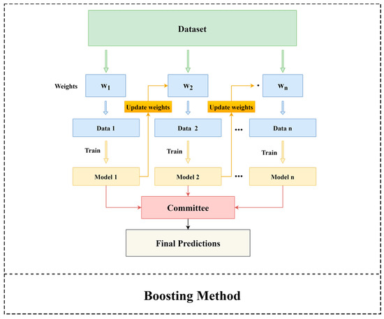 Figure 7 shows a schematic diagram of the boosting algorithm. By combining several weak learners and increasing the sample weights for the subsequent model depending on the learning from the prior model, the boosting method creates strong learners [41]. As a result, each subsequent learning outcome is influenced by the preceding one, and the amount of decision trees increases the weight of the data. In the boosting algorithm, the model is constructed by iterating in steps, and weak learners are built to compensate for weaknesses in the existing model during each iteration [42].