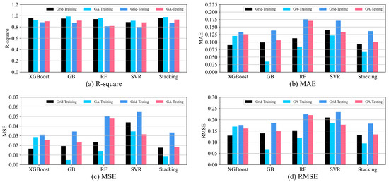 The performance of the algorithms after grid search and GA tuning parameters is shown in Figure 9. The of the five algorithms is shown in Figure 9a. The of the training set for all models with parameter tuning was higher than that of the test set. In addition, the of the test set for the models with parameter tuning by GA was higher than that of the grid search. Among all the models, the model using SVR had the largest improvement after adjusting the parameters using GA. At the same time, the value of MAE, MSE, and RMSE also decreased the most (Figure 9b–d). This means that the model with GA tuning can further improve the performance, which is consistent with the performance comparison of other models. Like the case of , the performance of the test part of all algorithms is always weaker than the training part. The stacking model parametrized by GA had the best performance with the highest and the lowest value of MAE, MSE, and RMSE. Overall, the model’s predictive performance was enhanced when parameters were optimized via GA as opposed to grid search.
